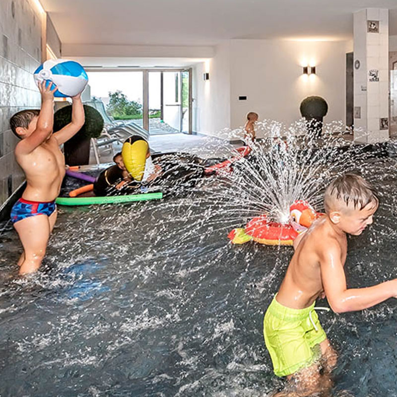 We guarantee wellness fun for the entire family! Our sauna area is accessible to guests who are 16 years or older, but that does not mean that as a family with children you have to do without the sauna. Our non-nude sauna invites young and old to sweat, without age limit. Enjoy great water fun in our spacious indoor and outdoor pools, which can be used by our little guests until 4.30 p.m. Afterwards, it is reserved for adults aged 14 and over. And of course, we also have a pool for our little guests: Our children's pool is separated from the large pool area but still in the immediate vicinity. And if the children get tired of wellness, they will find our playrooms with games and fun for all ages right next to the wellness area. Nothing stands in the way of your perfect family vacation!