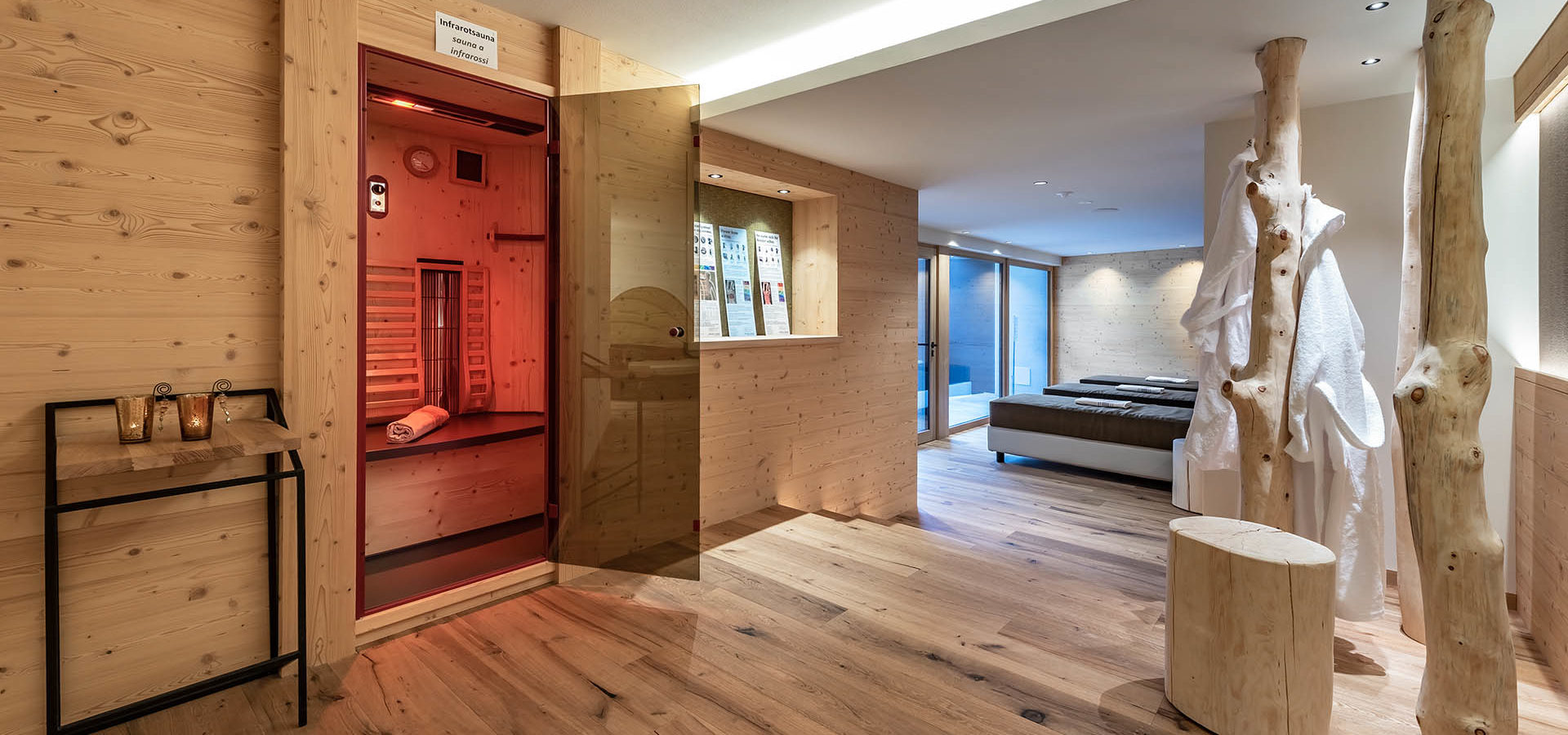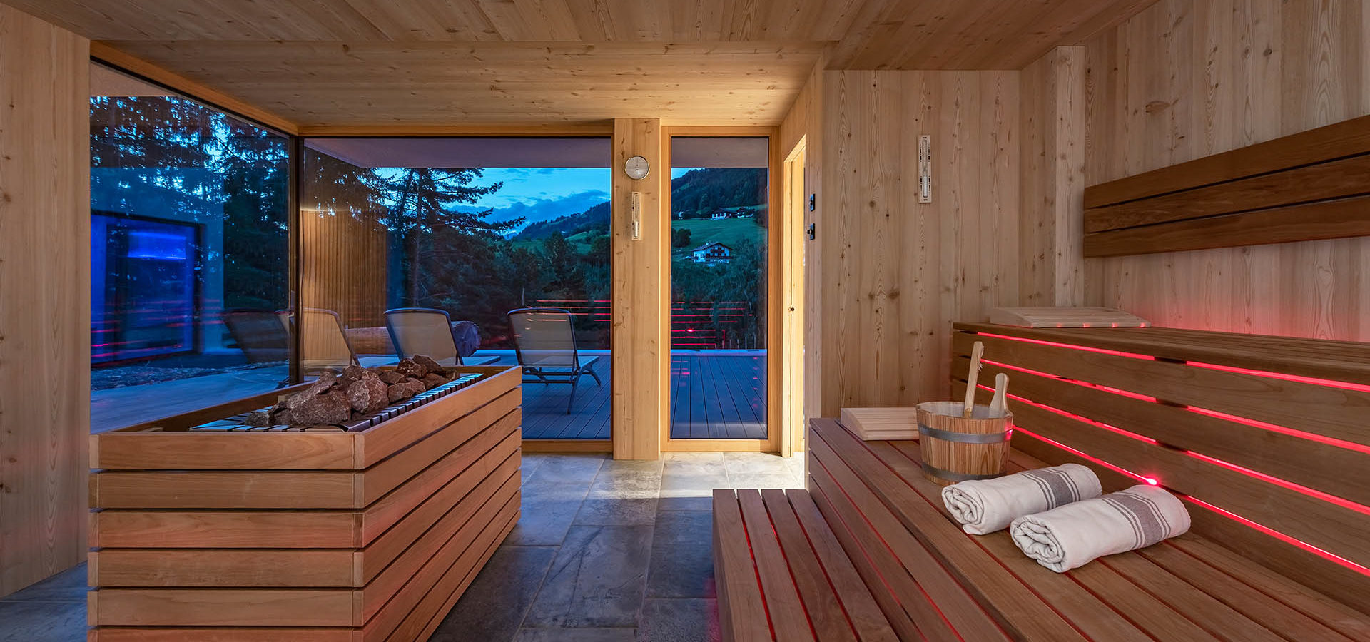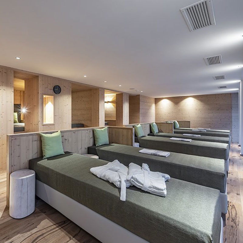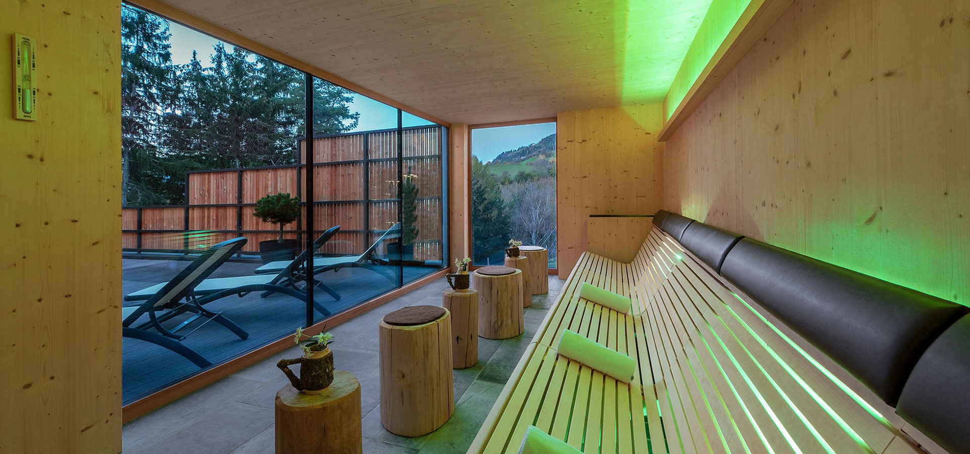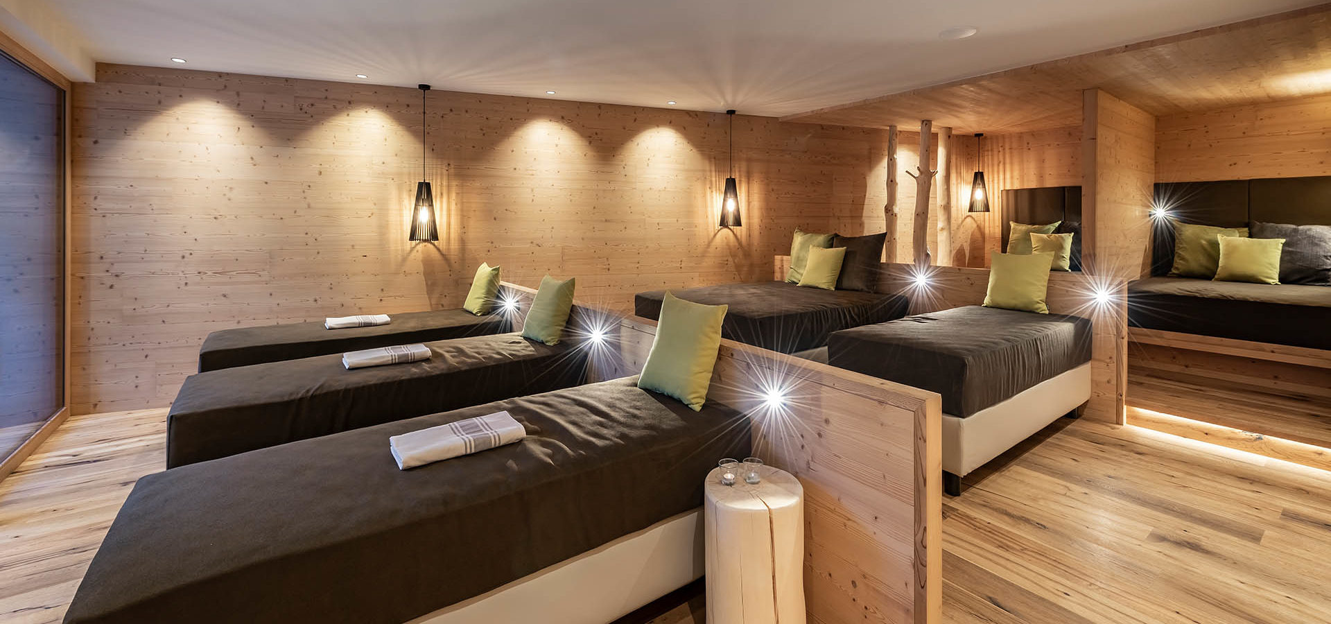 Do you like it hot? Take your time and visit our Finnish Panorama Sauna or our Bio Sauna. A more pleasant experience on a cold winter day is inconceivable. Extensive saunas dispel tension, give them new strength and bring body and mind back into harmony. Spend a whole sauna evening in your wellness holiday in South Tyrol. You can also explore our Turkish steam bath, the infrared sauna and our dress family sauna. Our cold nebula shower will then provide you with refreshing cooling. Afterwards, our cozy and spacious relaxation rooms with discreet wellness music and beautiful views await you.