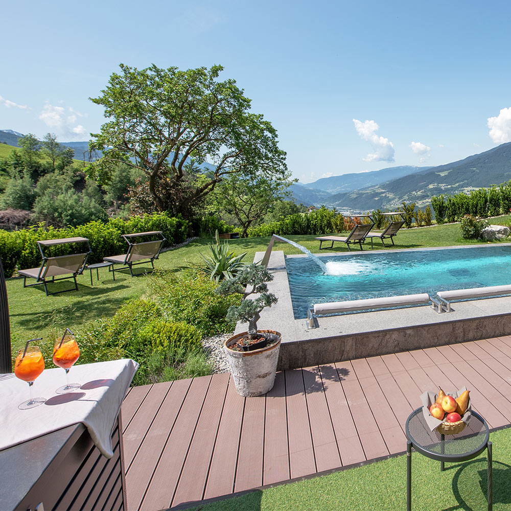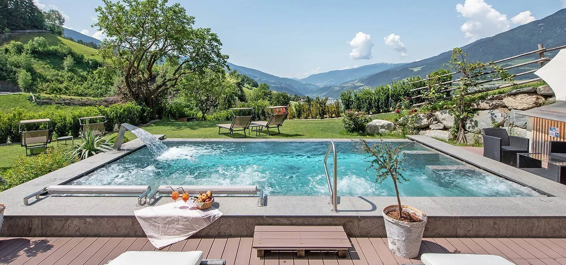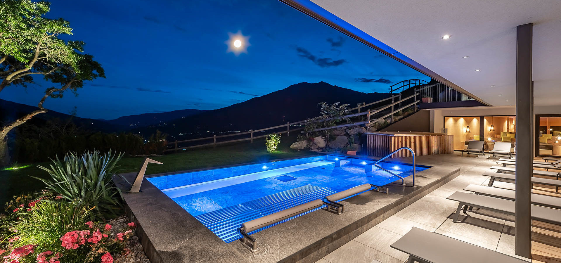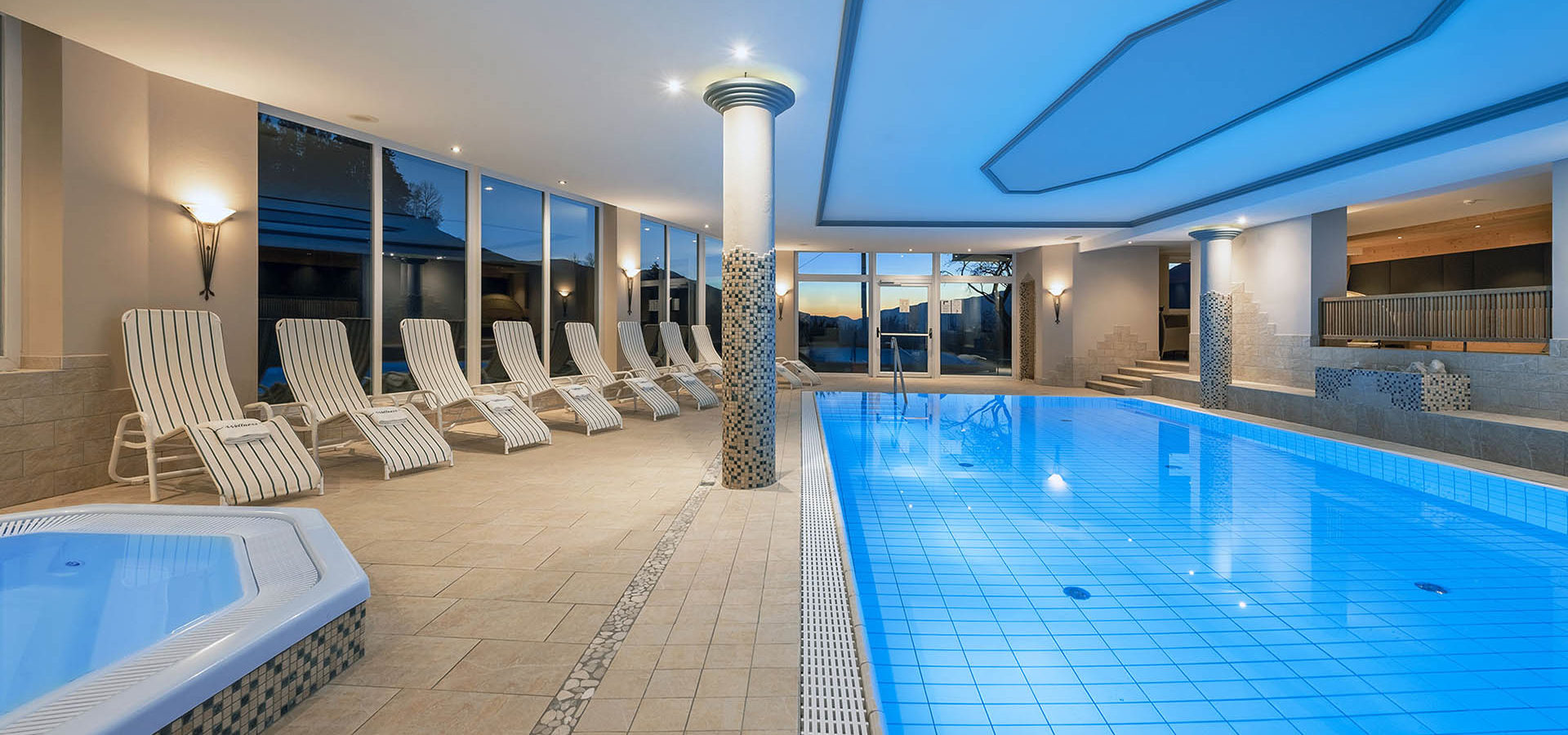 Isn’t that glorious! Whenever you are there, you can refresh yourself in our panoramic indoor pool. Make a few laps in the large pool with countercurrent system to relax. When you visit our wellness hotel at Brixen, you will keep your body smoothly while swimming. In the water you will find the perfect balance for all activities outside in the nature of South Tyrol. On the sun loungers, you can enjoy a great panorama view over Brixen and the Eisack valley through the wide window front. Our panoramic indoor pool, by the way, has a constant water temperature of 30°C every season, the connected whirlpool is even a bit warmer.