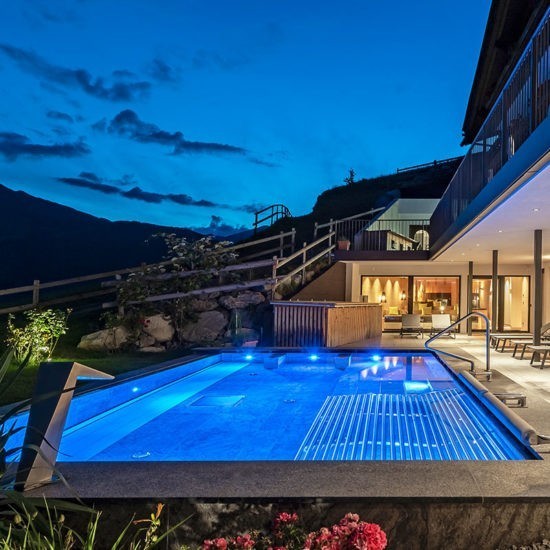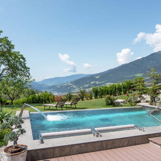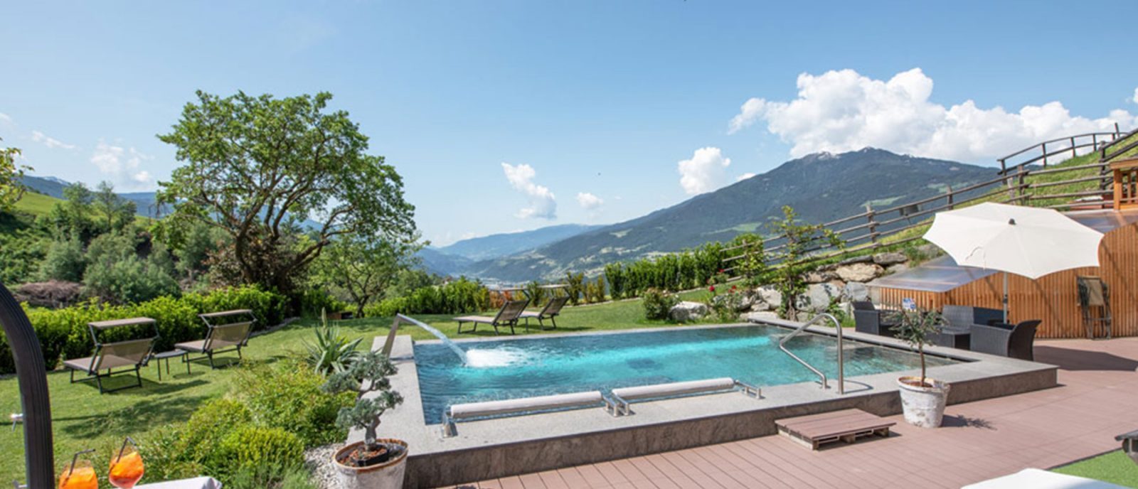 Whirlpool mit mehreren Massage-Anwendungen und Liegewiese mit Südterrasse
